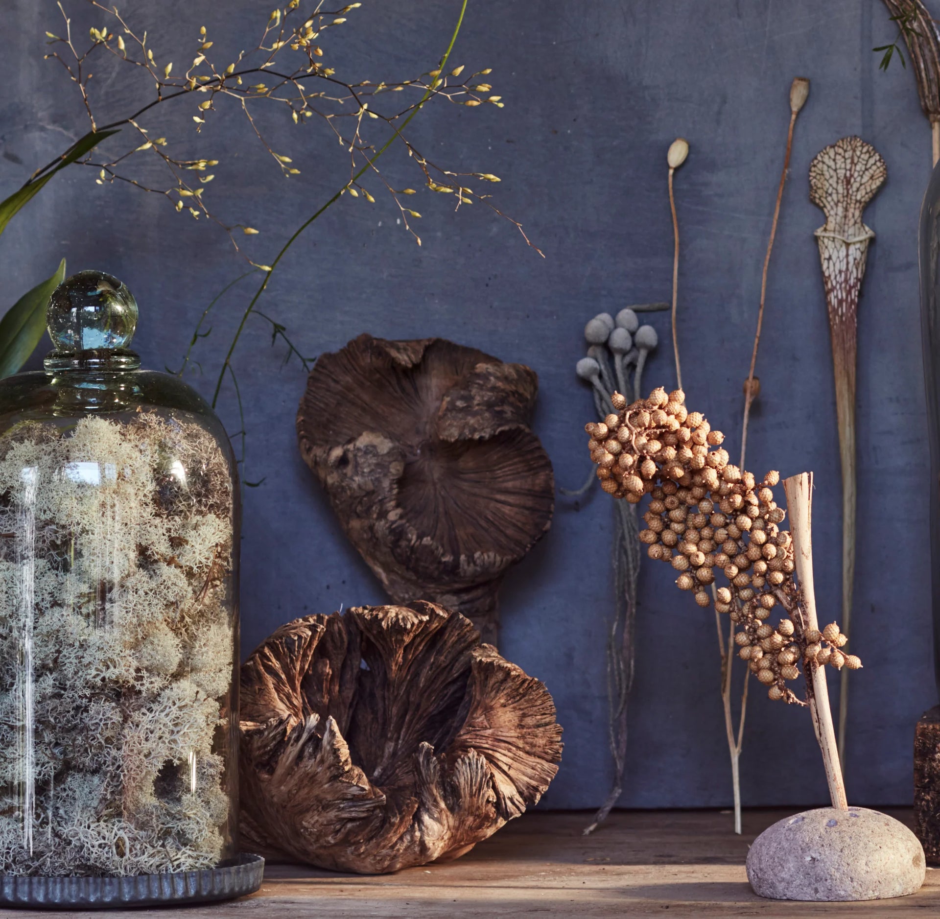 “I like things that retain a shape. If they’re too small, they look like dust catchers,” explains Hilary. “When you’re working on an arrangement with smaller, more delicate things they’re always slightly brittle, which is why I lean toward larger blooms. A dried allium has a nice, sculptural shape. The leaves you get from the Caribbean are sculptural, and they’re more interesting to work with. Another dry favorite is bayberry. I absolutely adore it – a grey berry on a branch. I always have them at home and you don’t need more than 1 or 2.”