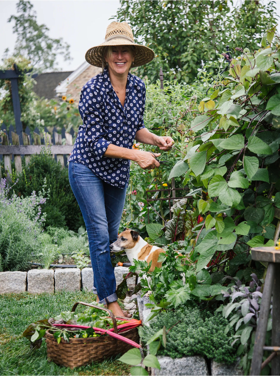 Pictured: Helen in the "Kitchen Garden" with Grizzly, the family's Jack Russell Terrier, harvesting Swiss Chard for dinner.