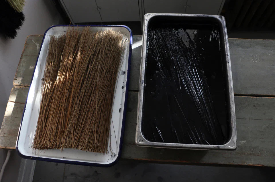 Broom samples with different colored handles and natural-dyed sorghum brush.