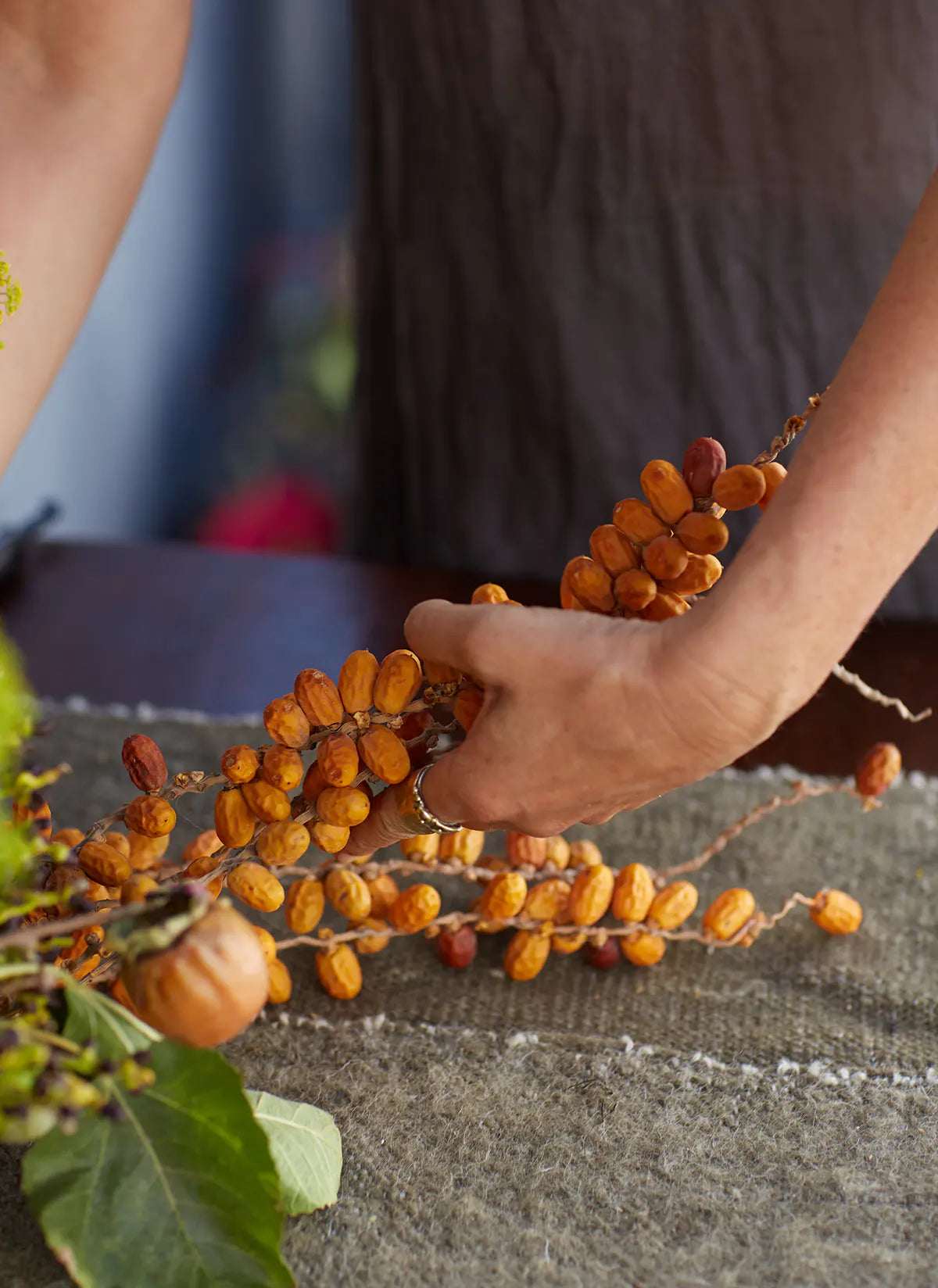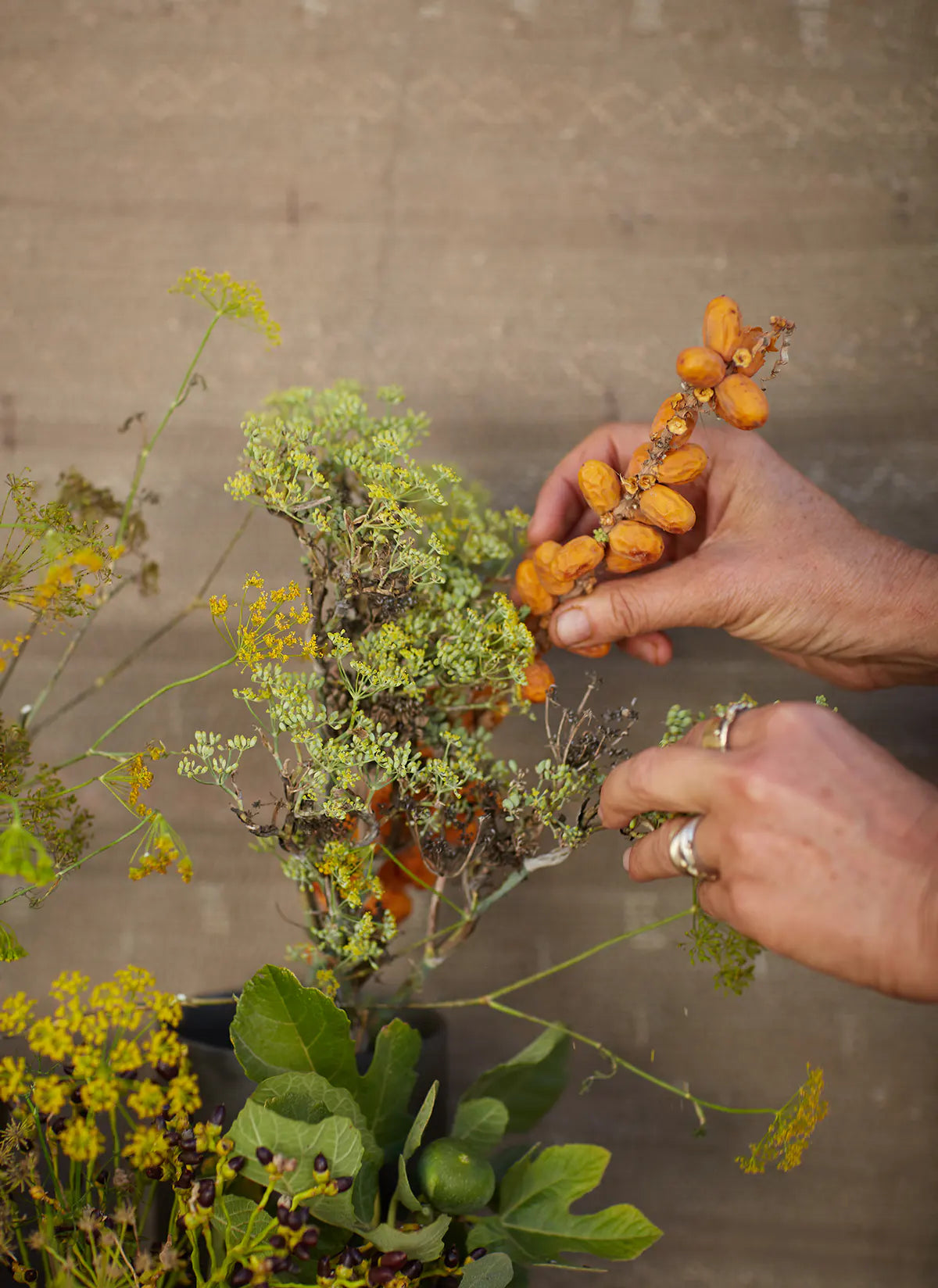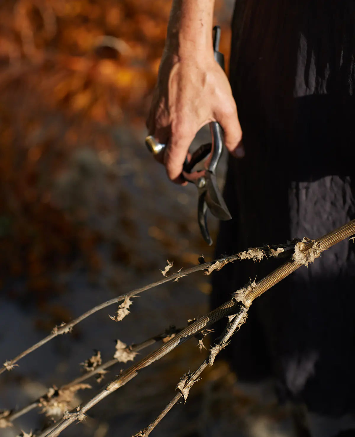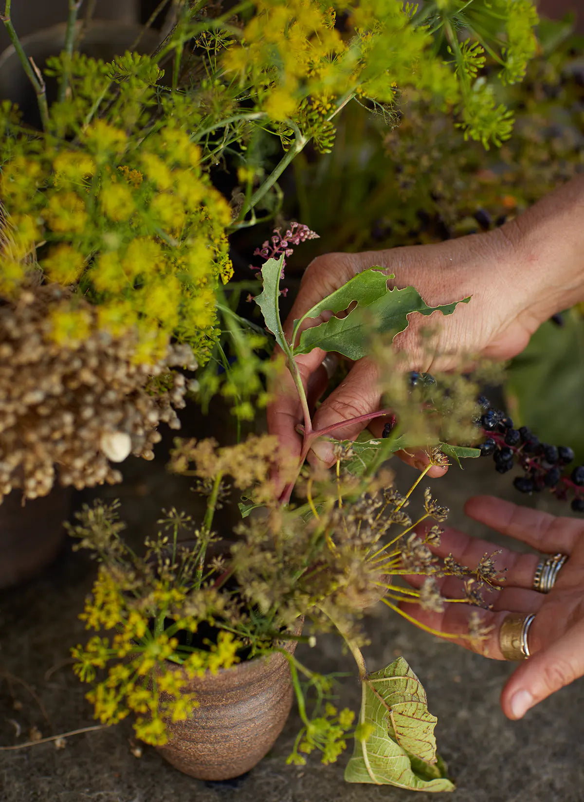 I think people are fearful about scale — they’ll get afraid of a piece tipping over; just start with a heavy vessel. The work begins in the cut — if you’re foraging or gleaning, once you cut something, you can’t make it longer, so err on the side of curvaceous and tall. When you’re building your arrangement, start with the branches that are the biggest, the most beautiful, that have the most poetic curvature.