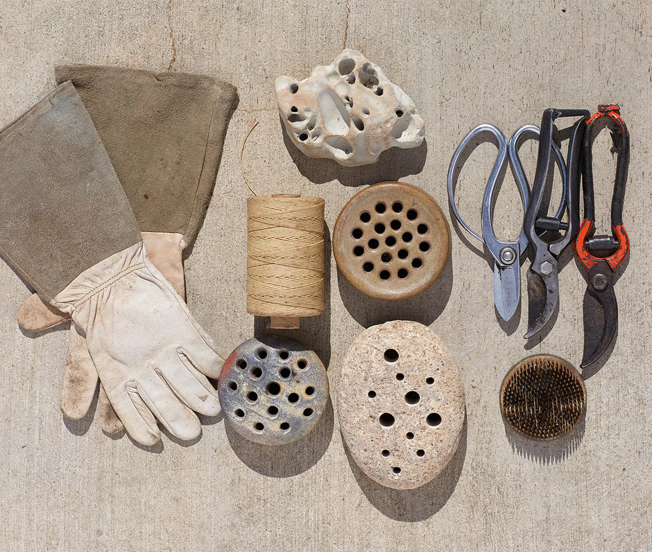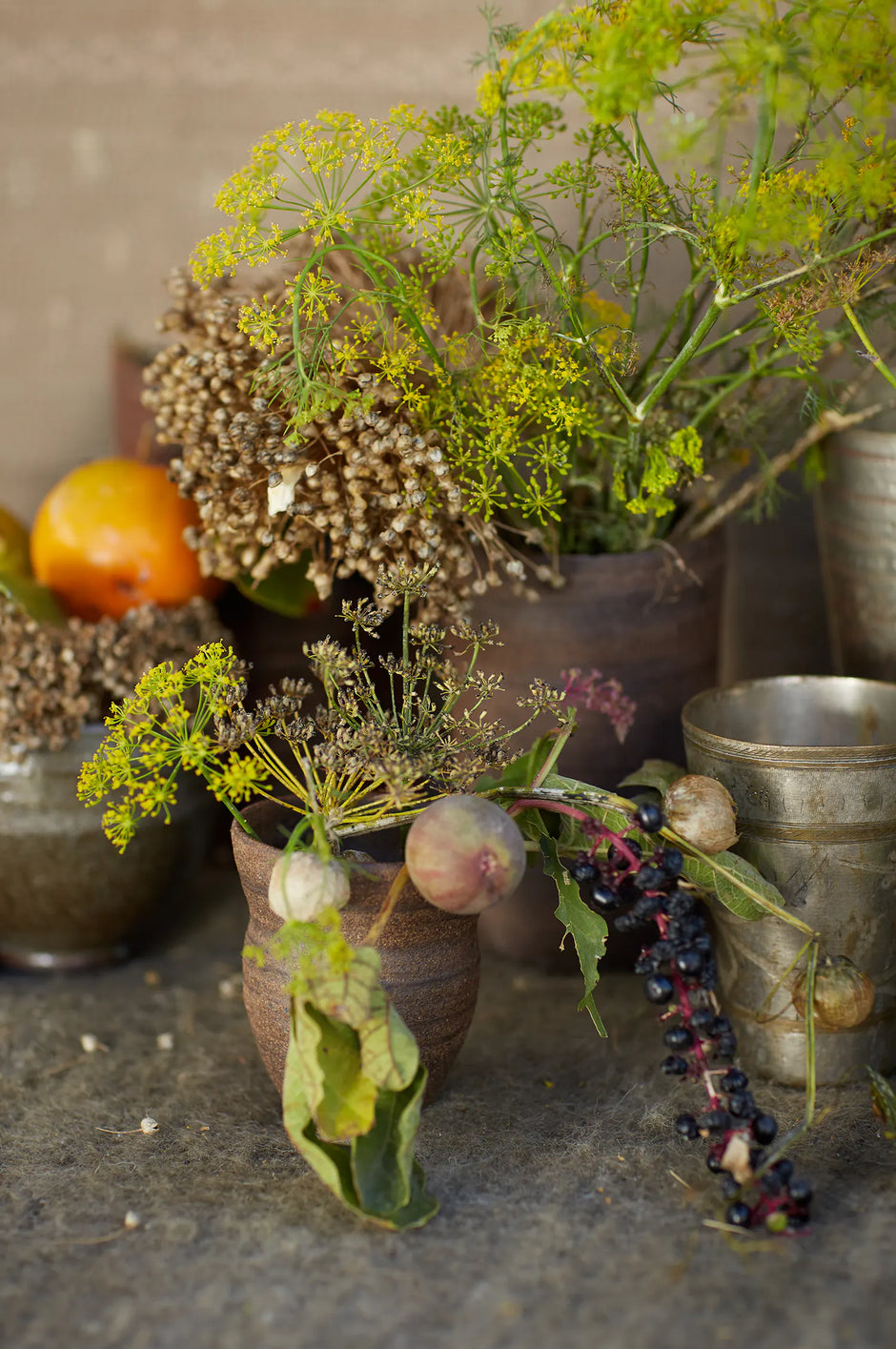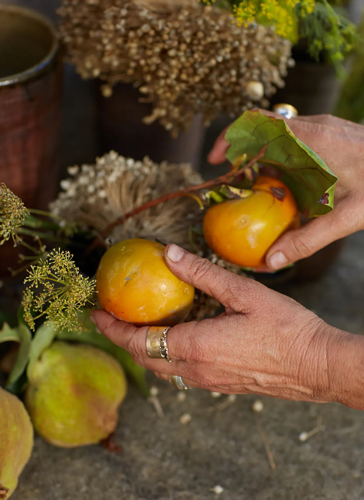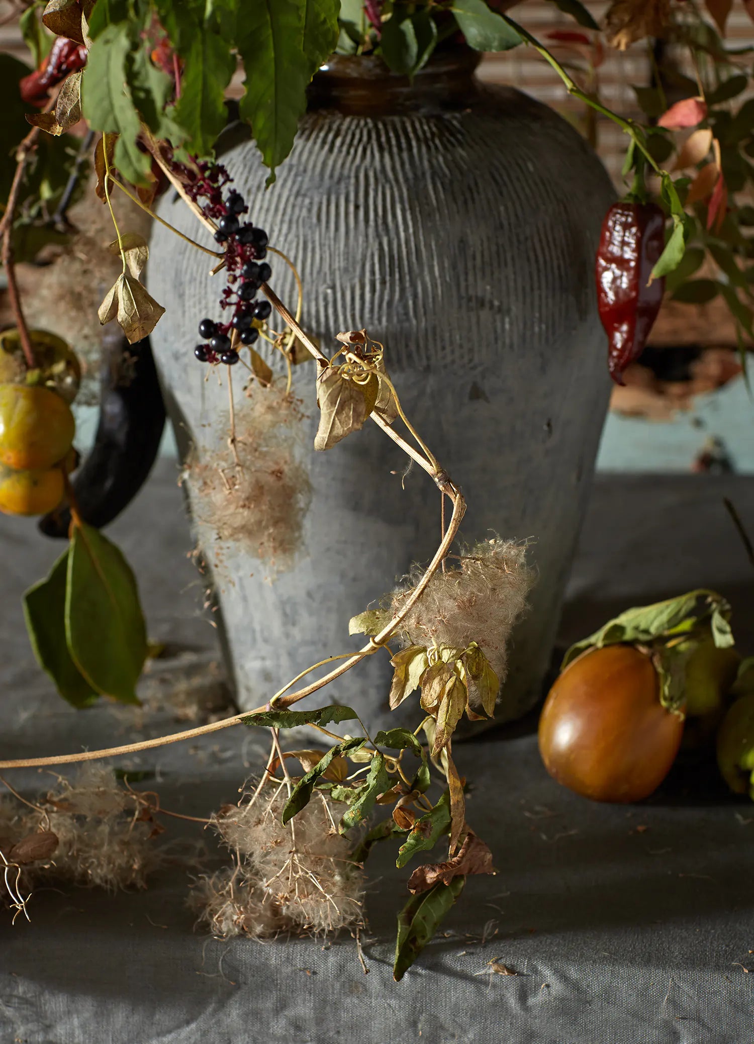 I think people are fearful about scale — they’ll get afraid of a piece tipping over; just start with a heavy vessel. The work begins in the cut — if you’re foraging or gleaning, once you cut something, you can’t make it longer, so err on the side of curvaceous and tall. When you’re building your arrangement, start with the branches that are the biggest, the most beautiful, that have the most poetic curvature.