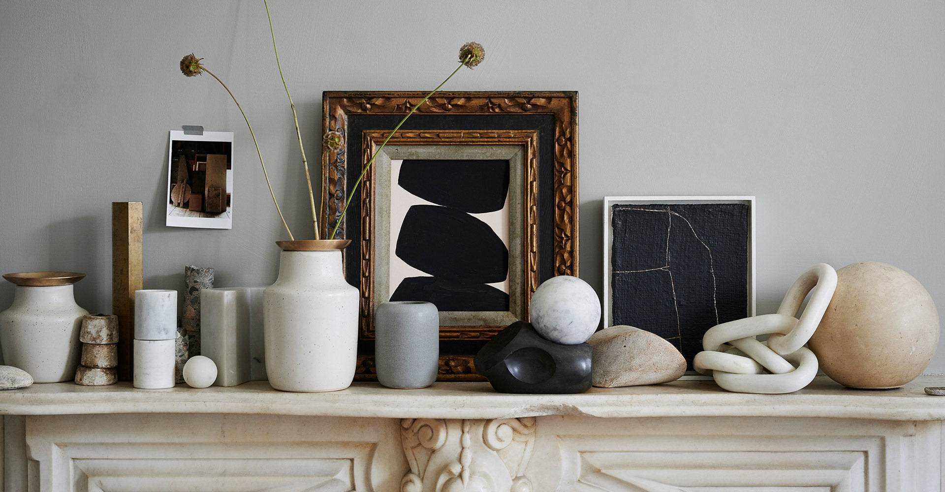 Get inspired by this mantle decorated with the timeless beauty of neutral tones. Thoughtfully arranged vases and decor create a balanced, sophisticated look that complements any space.