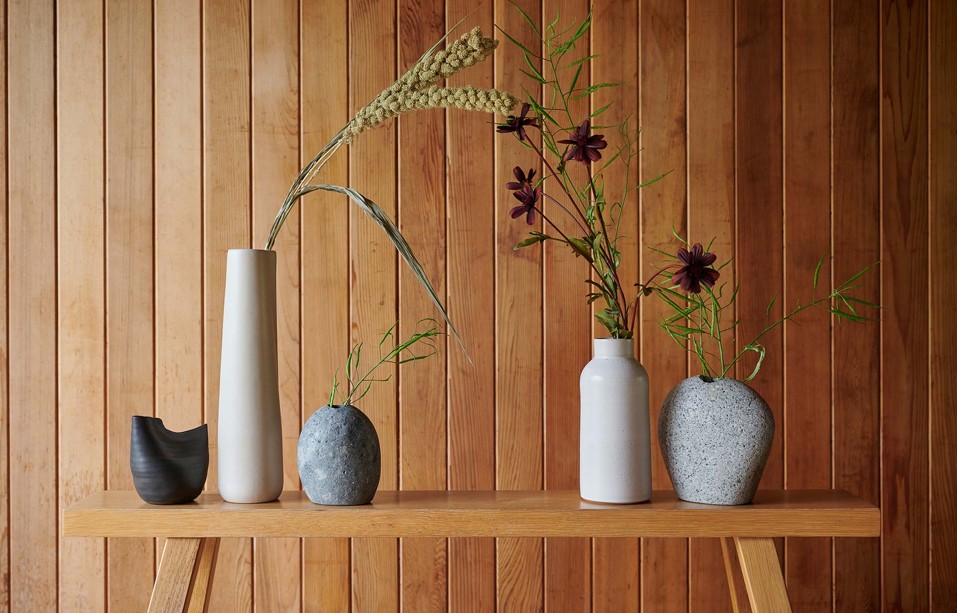 Let the subtle elegance of dried botanicals and handcrafted stone vases bring the serenity of a windswept meadow into your home.