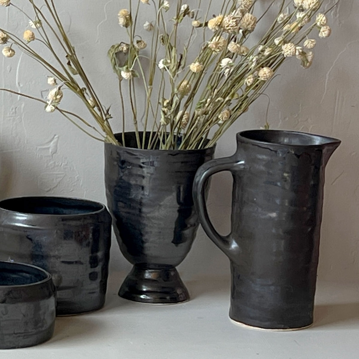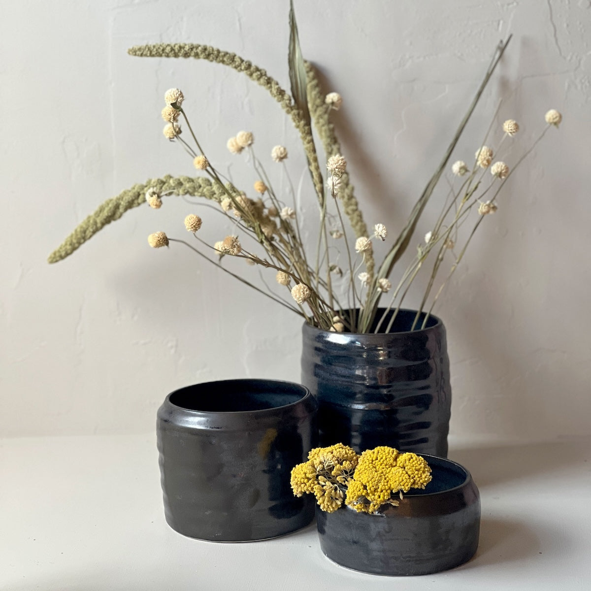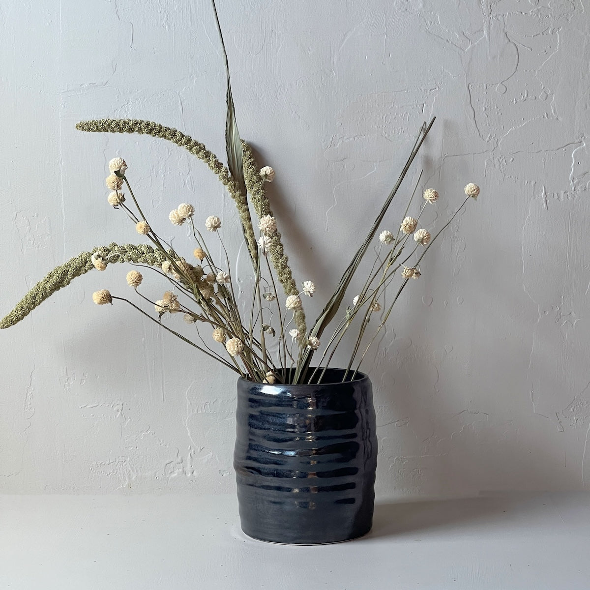 Each blue vase is cast from an original hand-thrown piece and enhanced by custom glazes created and mixed in small batches. The mussel glaze offers a dynamic gunmetal hue with a metallic sheen, varying from matte to glossy depending on thickness and placement. The snowflake glaze is a satin-finished warm white. You will see some gentle sparkly sheen, hence the name snowflake. It is a warm white. You may see some organic specks on your piece—we do not consider these defects, just part of the handmade nature of DBO Home’s work.